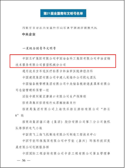 9月19日,共青團中央、最高人民法院、國家發(fā)展改革委、工業(yè)和信息化部、公安部、司法部、交通運輸部、水利部、商務部、國家衛(wèi)生健康委、應急管理部、國務院國資委、全國工商聯(lián)等23家全國創(chuàng)建青年文明號活動組委會成員單位聯(lián)合印發(fā)《關于命名第21屆全國青年文明號并進行星級認定的決定》(下稱《決定》)。中國五礦、中冶集團所屬中冶寶鋼重型機械分公司榮獲“一星級全國青年文明號”。